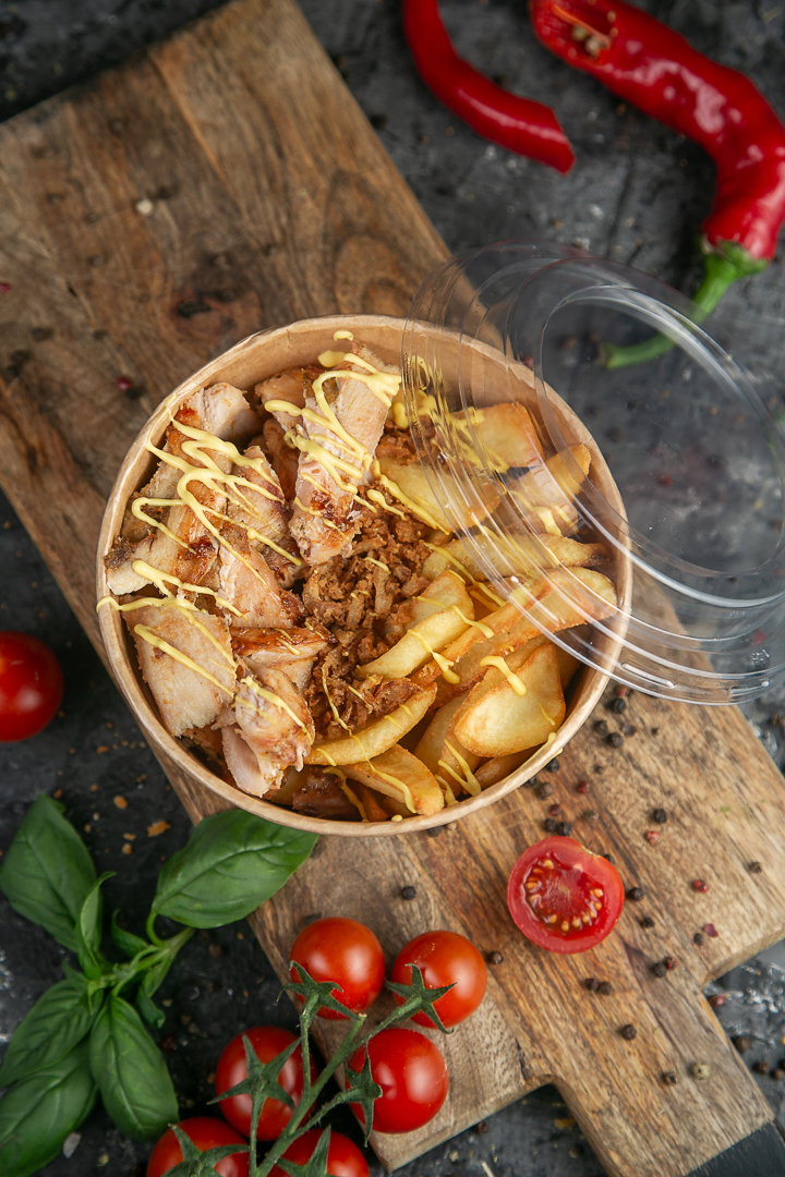 грильоване м'ясо курки, свіжі помідори з огірком, пекінська капуста, в поєднанні з фірмовим червоним та білим часниковим соусом, загорнуте у смачний лаваш та нашу ❤️