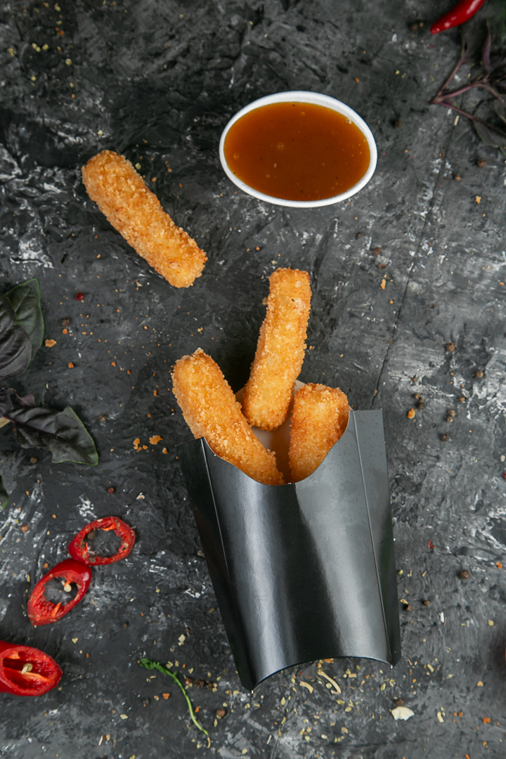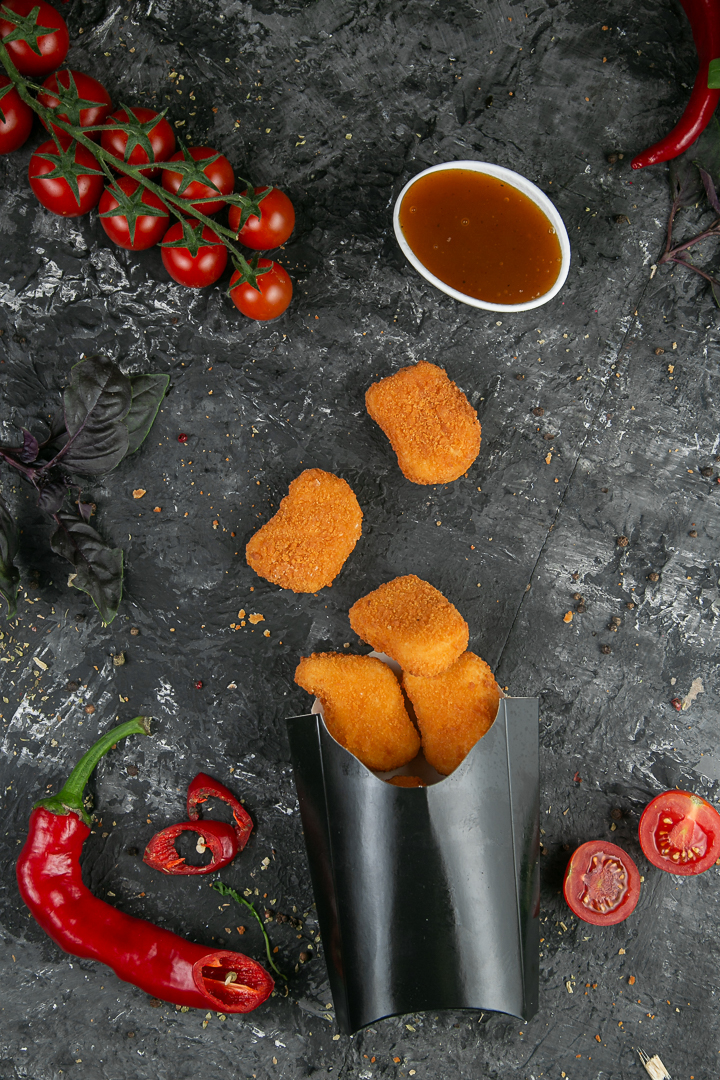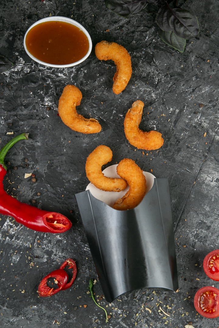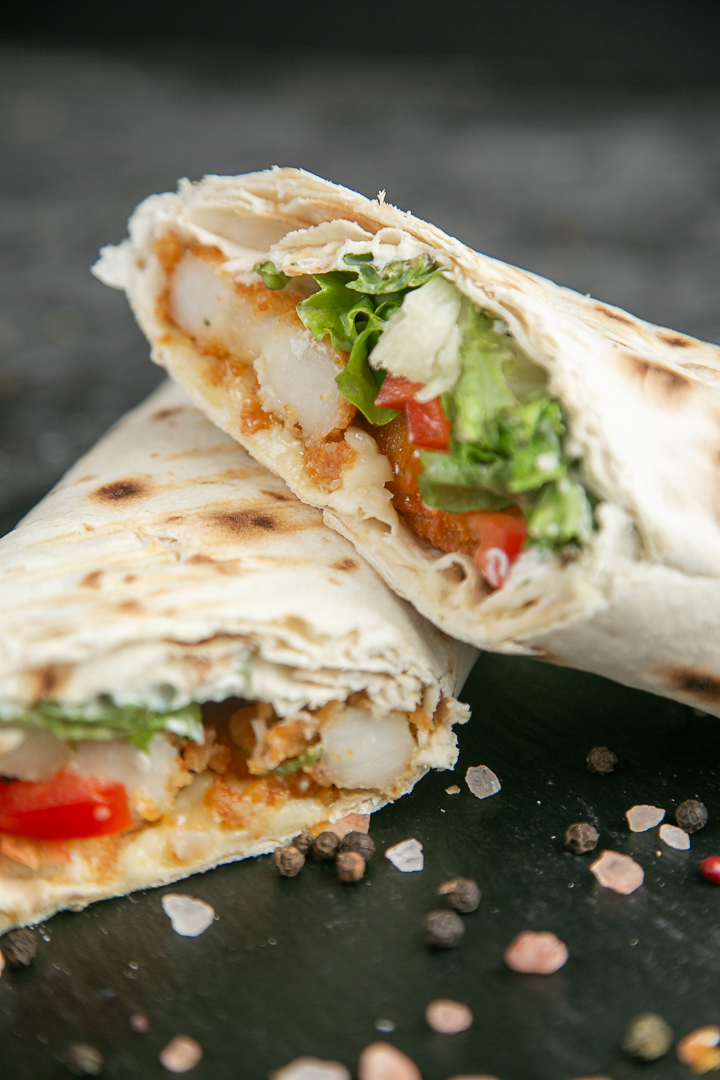 Неперевершене поєднання смаків: Креветки у паніровці, солодкий перець, консервований ананас, листя салату, моцарелла та крем-сир, заправлені кисло-солодким соусом, загорнуті у смачний лаваш.