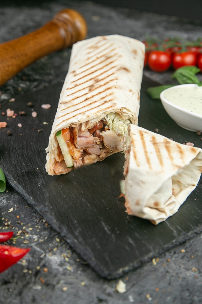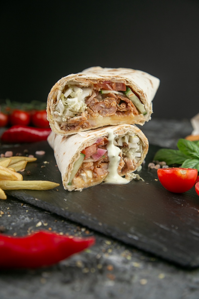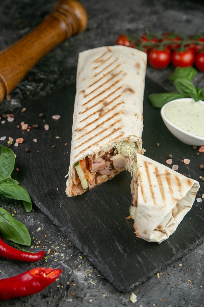 Запашне грильоване м'ясо курки, свіжі помідори з огірком, пекінська капуста, в поєднанні з фірмовим червоним та білим часниковим соусом, загорнуте у смачний лаваш та нашу ❤️