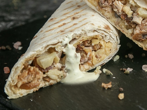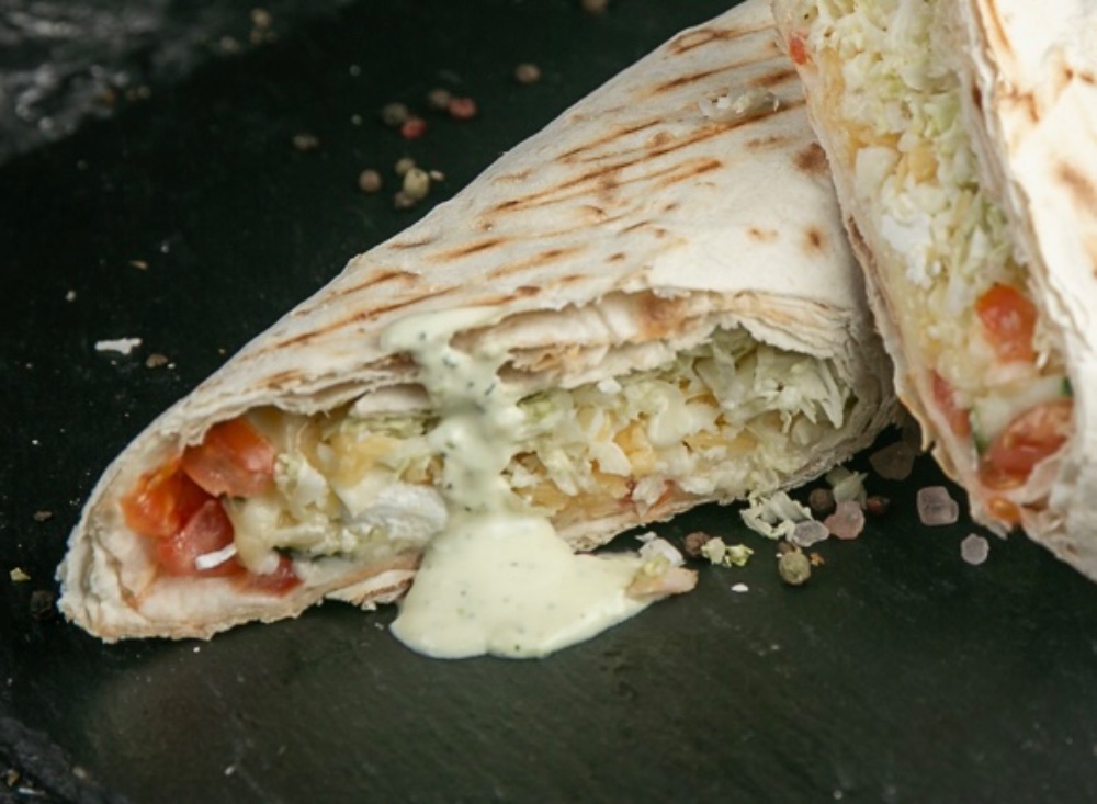 Багато соковитого грильованого м'яса курки у поєднанні з міксом сирів, свіжого болгарського перця та помідорів, заправлене фірмовим білим часниковим соусом, у лаваші.